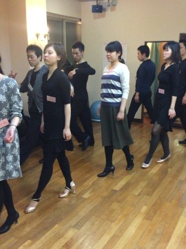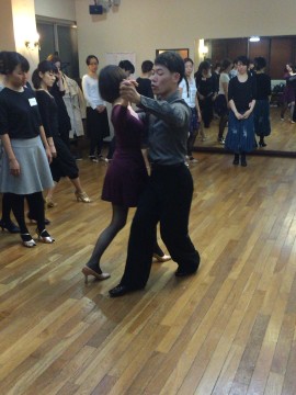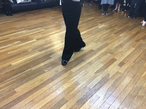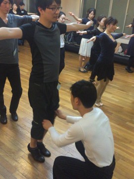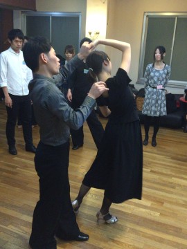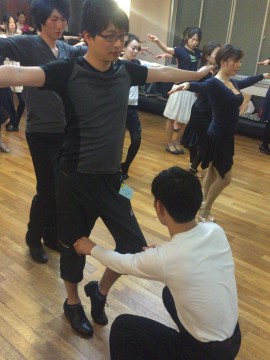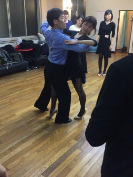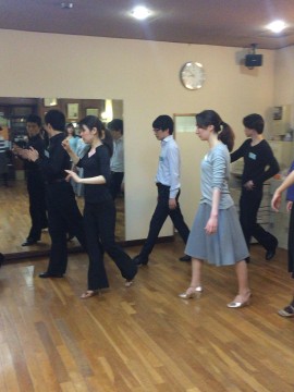 パートナーさんはリーダーさんの脚の間へ前進の1歩目です。