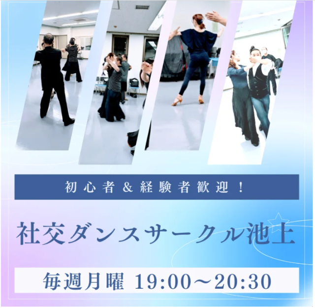 | 制限・特徴 | 社交ダンスサークル「社交ダンスサークル大田区池上」は、東京都大田区池上を拠点に、20代〜30代を中心とした若い世代に社交ダンスの楽しさを伝えているサークルのようです。毎週水曜・木曜の夜に池上地区センターで活動しており、レッスンは地元出身のJDSF競技ダンサーが講師を務めているそうです。 |