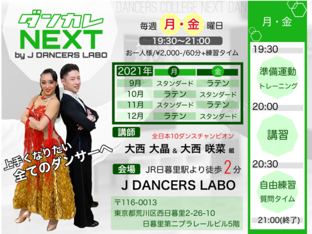 J DANCERS LABOの「ダンカレNEXT」は、これからもっとダンスを上達させたい人に向けた、ちょっと本格的で充実したレッスンのようです。モダン・ラテンともにトップレベルの大西大晶・大西咲菜組が指導を担当していて、テクニックはもちろん、体の使い方や基礎づくりまで丁寧に見てくれるそうですよ。1回ごとに完結する内容なので、途中からの参加でも安心してついていけるのがうれしいですね。