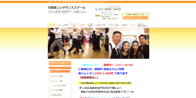 日暮里ニシダダンススクールは、東京都荒川区東日暮里の月安第二ビル4階にスタジオを構える社交ダンス教室で、日暮里駅から徒歩約5分の立地にあるようです。サイトには初心者向けの無料体験レッスンが案内されており、その後に割安な単発レッスンや入門コースの選択肢を設ける料金体系が紹介されています。料金ページには、個人レッスンの時間・料金区分や、入門コース、1か月単位の団体レッスンやキッズクラスの設定が示されているようです。スクールの特徴としては、「楽しく身体を動かす=心も身体も踊り出す」をモットーに、それぞれの理解速度に合わせた丁寧な指導が心がけられていると案内されています。また「日暮里ジルバまつり」「日暮里ダンスまつり」といった気軽に参加できる催しが月ごとに開催されているほか、ミニダンスパーティーや周年パーティーの予定が告知されており、レッスン以外の実践的な機会も設けられているようです。講師は競技実績のあるペアで指導にあたり、代表あいさつやスタッフ紹介ページも用意されているようですね。こうした構成から、初心者から経験者まで多様な受講ニーズを想定した教室運営をしているようです。