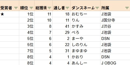 | 2位 | 54 | J池袋 | よしき | J池袋 | まゆまゆ |