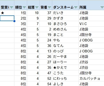 | 4位 | 45 | J池袋 | なおや | J OBOG | かじ |